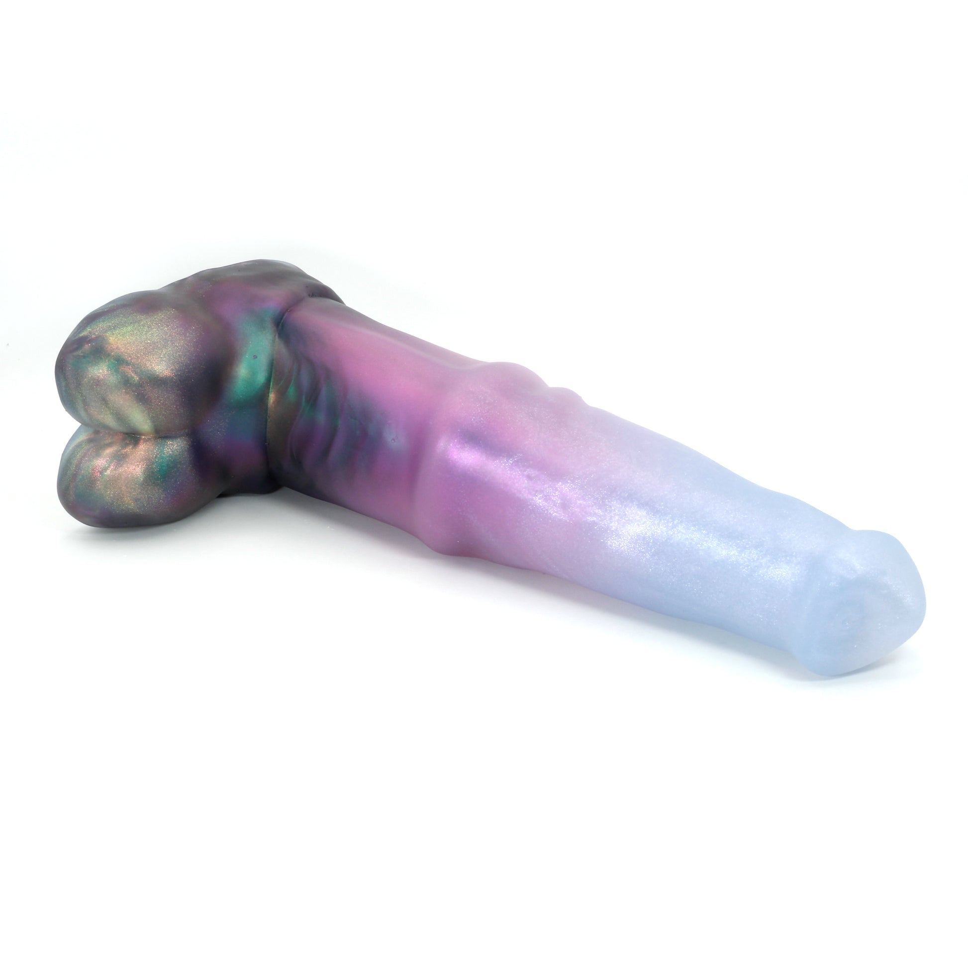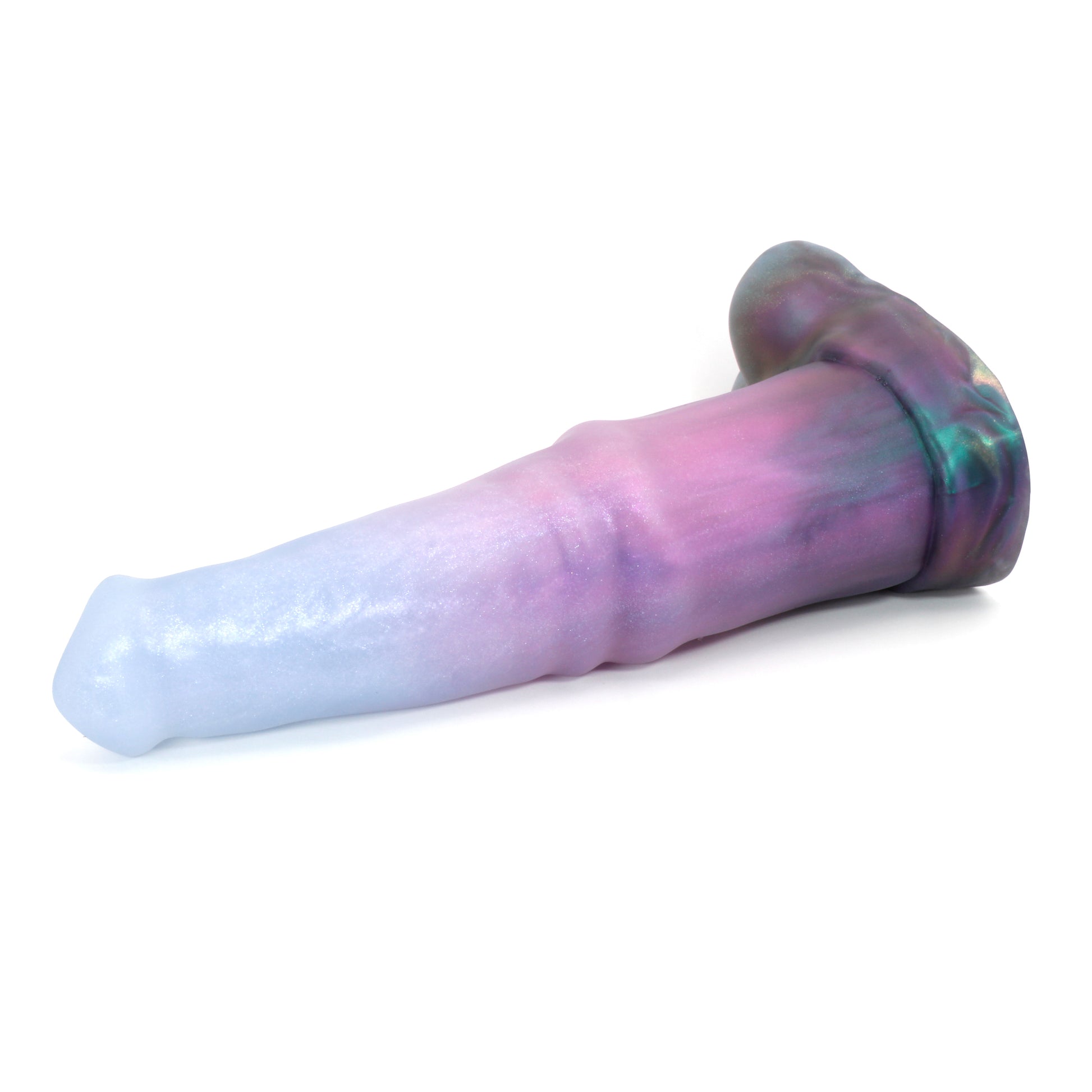 Please Note : This product is made with Near Clear Platinum Cure Silicone, there is an increased chance of bubble marks on the underside of the base, we do not consider this a flop and does not render the toy unsafe. Discoloration may be more obvious than standard Platinum Cure. Oil Based lubes and bodily fluids may stain, be sure to clean before and after every use with mild unscented soap.