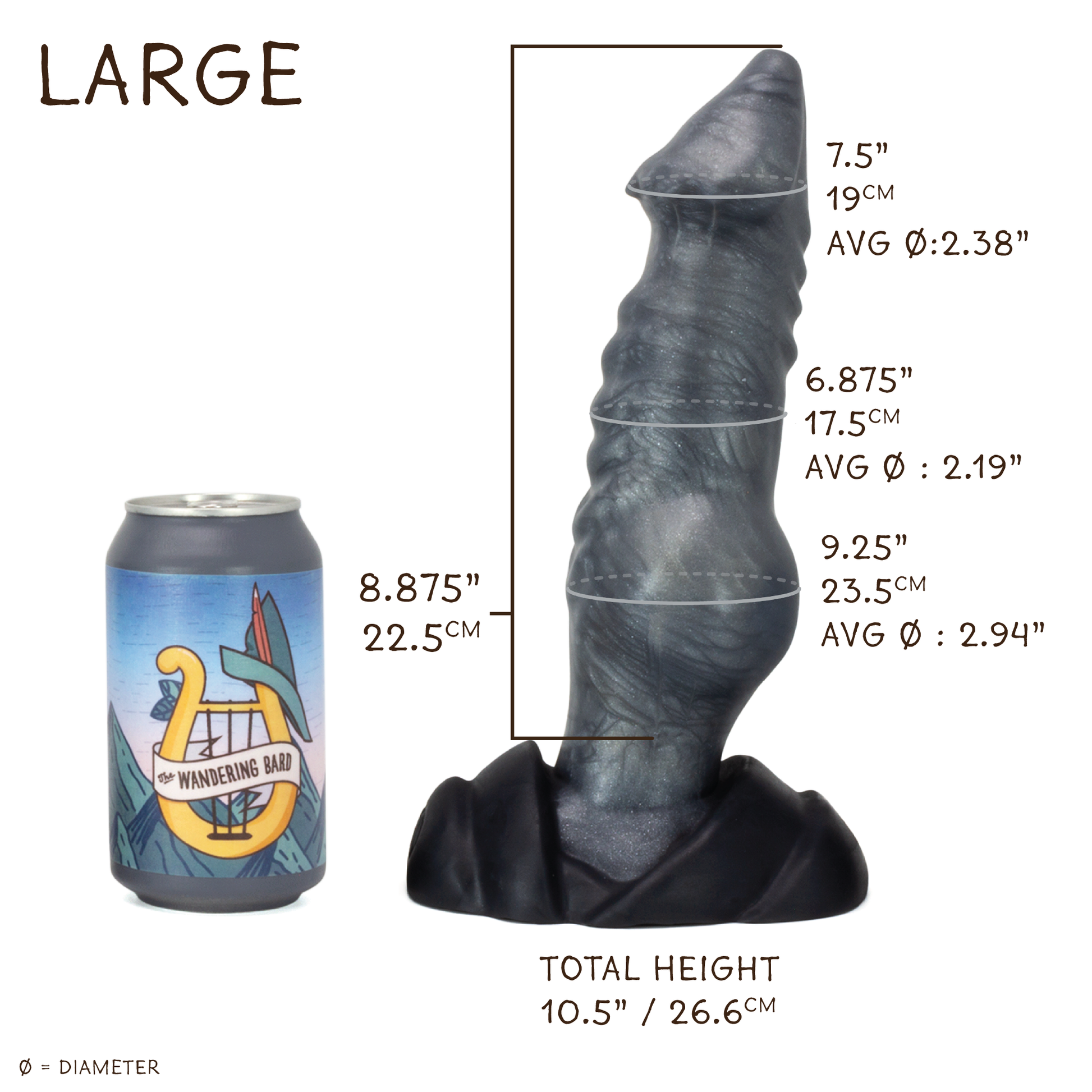Head Base Circumference: 7.5" / 19cm ; Avg Diameter: 2.38" Shaft Circumference: 6.875" / 17.5cm ; Avg Diameter: 2.19" Knot Circumference: 9.25" / 23.5cm ; Avg Diameter: 2.94" Above Base Circumference: 6.5" / 16.5cm ; Avg Diameter: 2.07" Usable Length: 8.875" / 22.5cm Total Length: 10.5" / 26.6cm