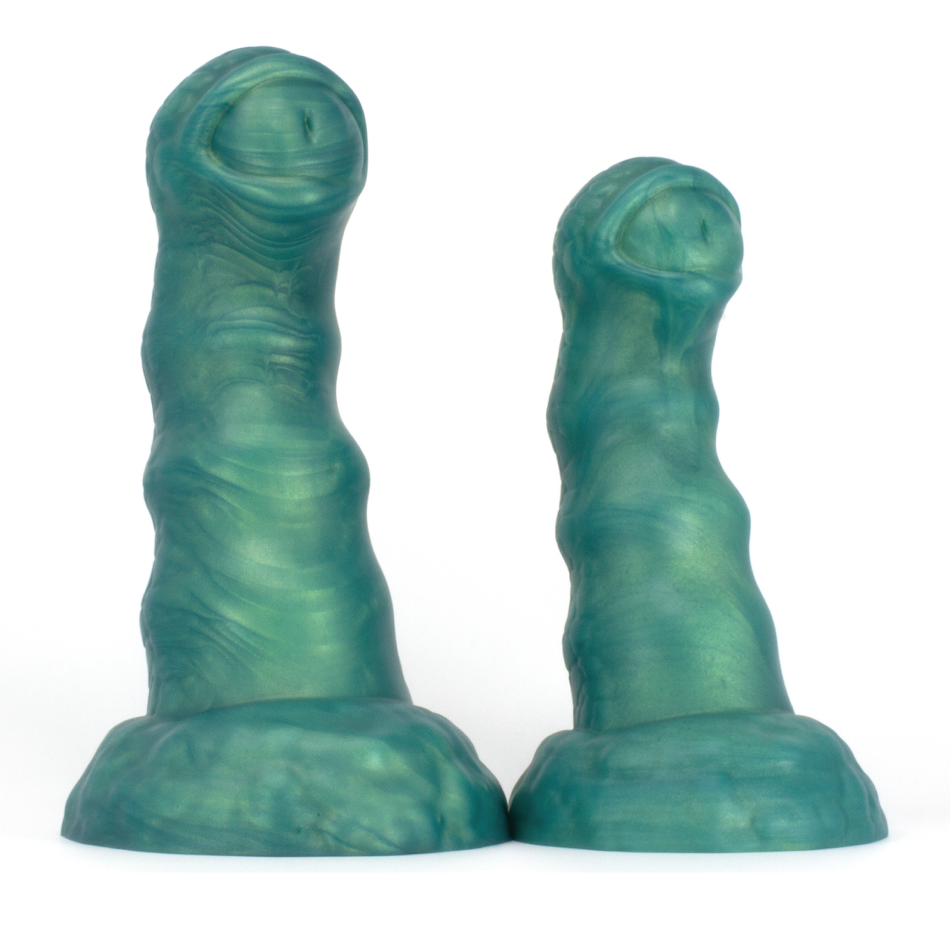 This Beholder eye stalk dildo features a round bulbous tip, textured shaft with rings meeting a flared base.