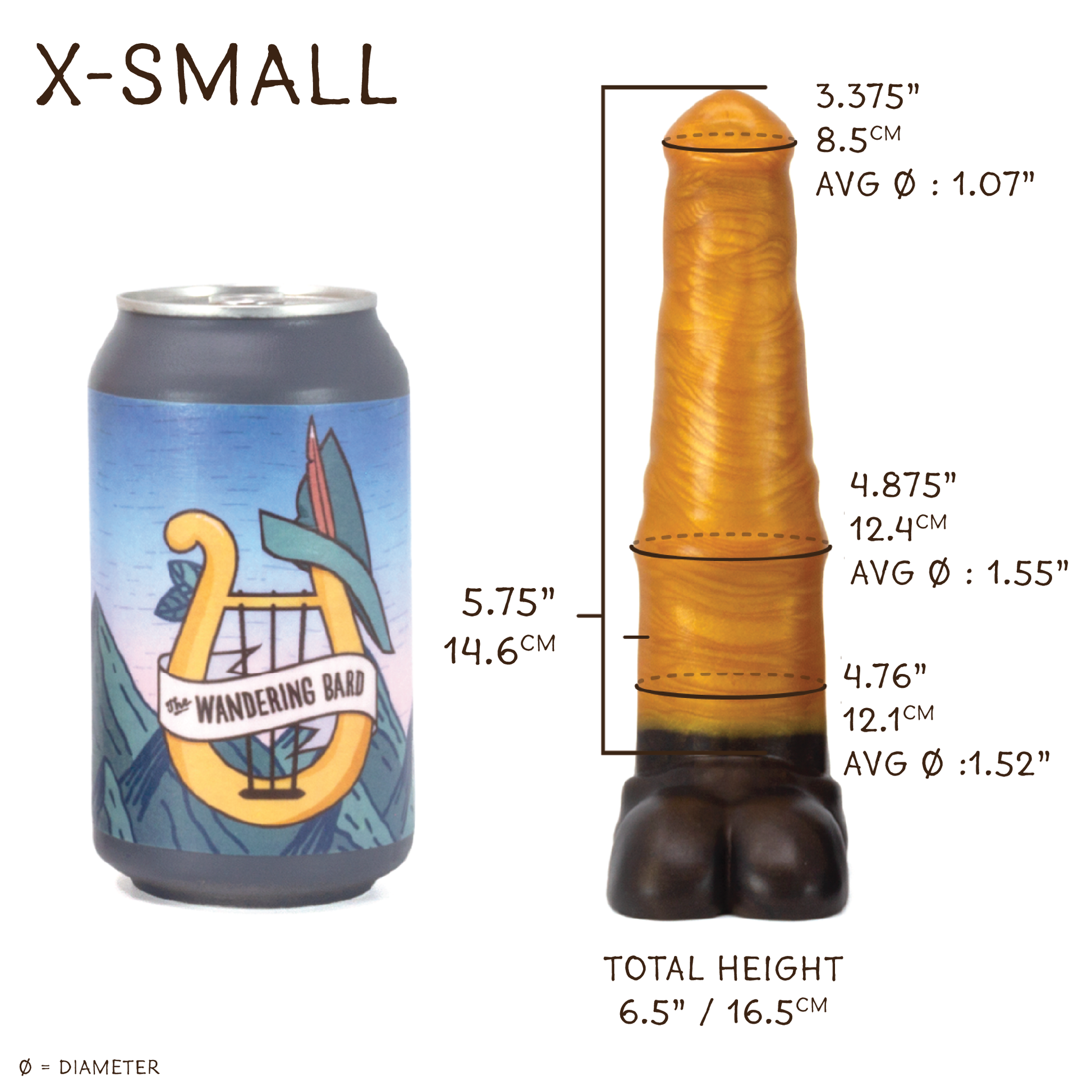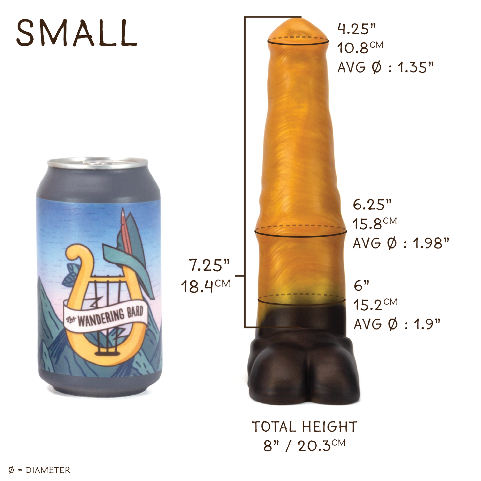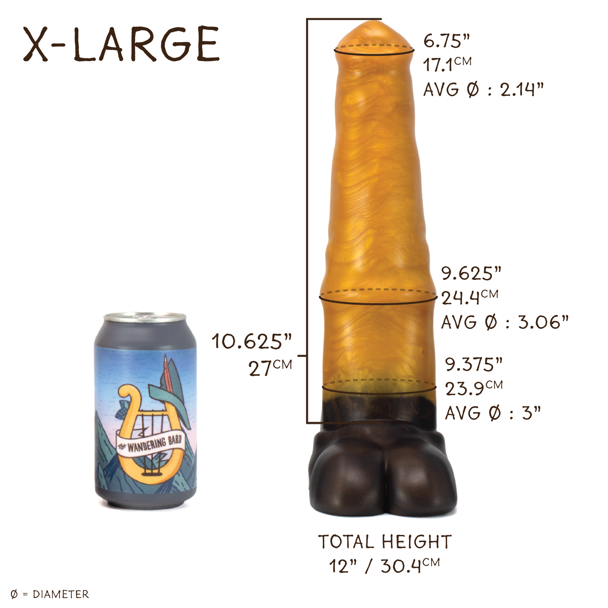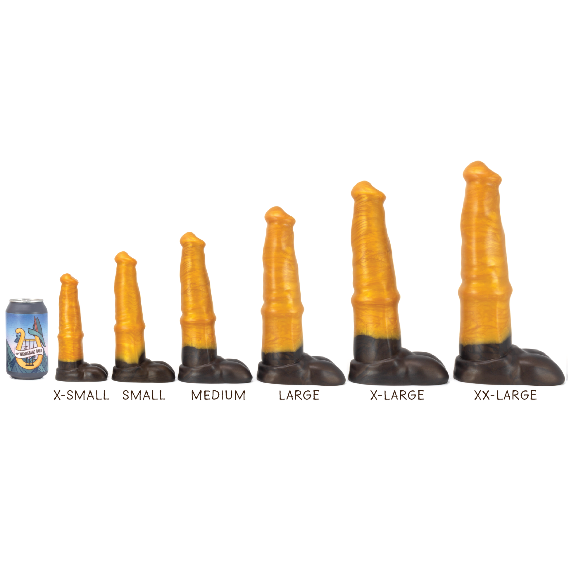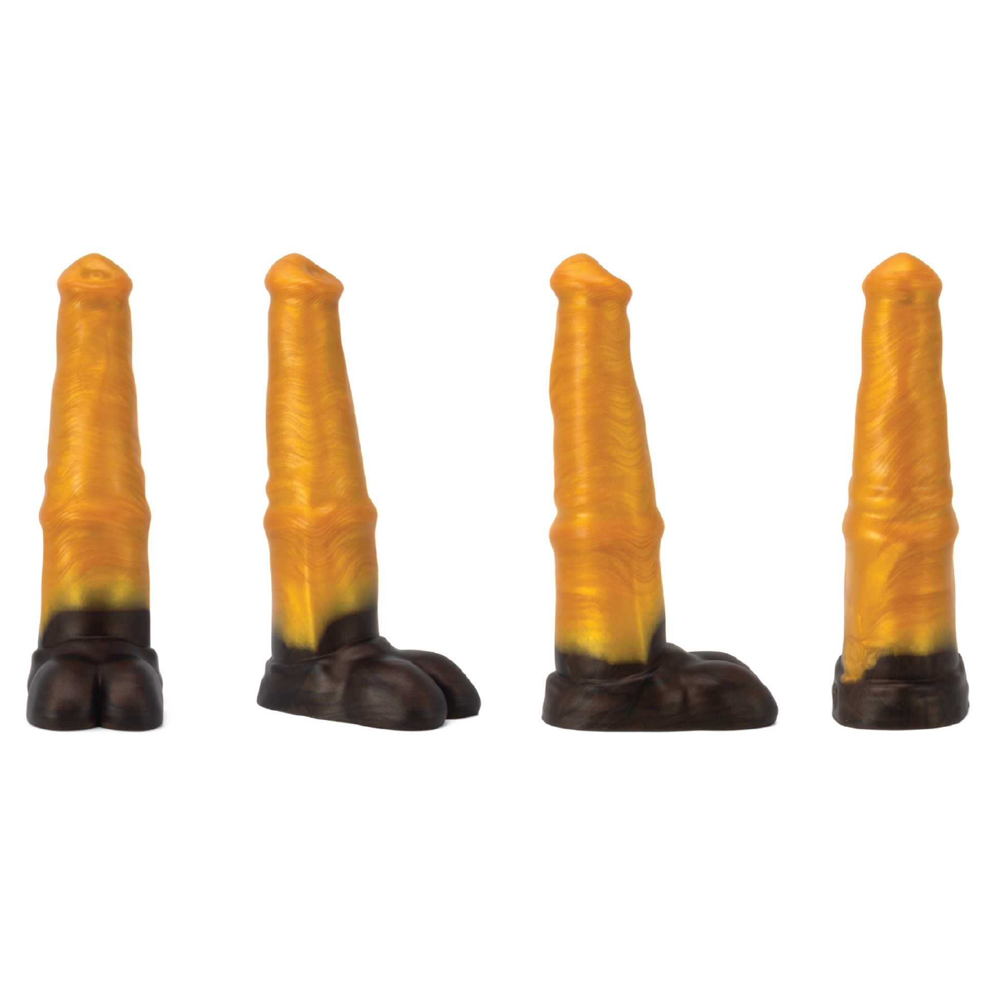 This equine dildo features a thin rounded tip, a gradual flared shaft with a medial ring that meets a flared base.