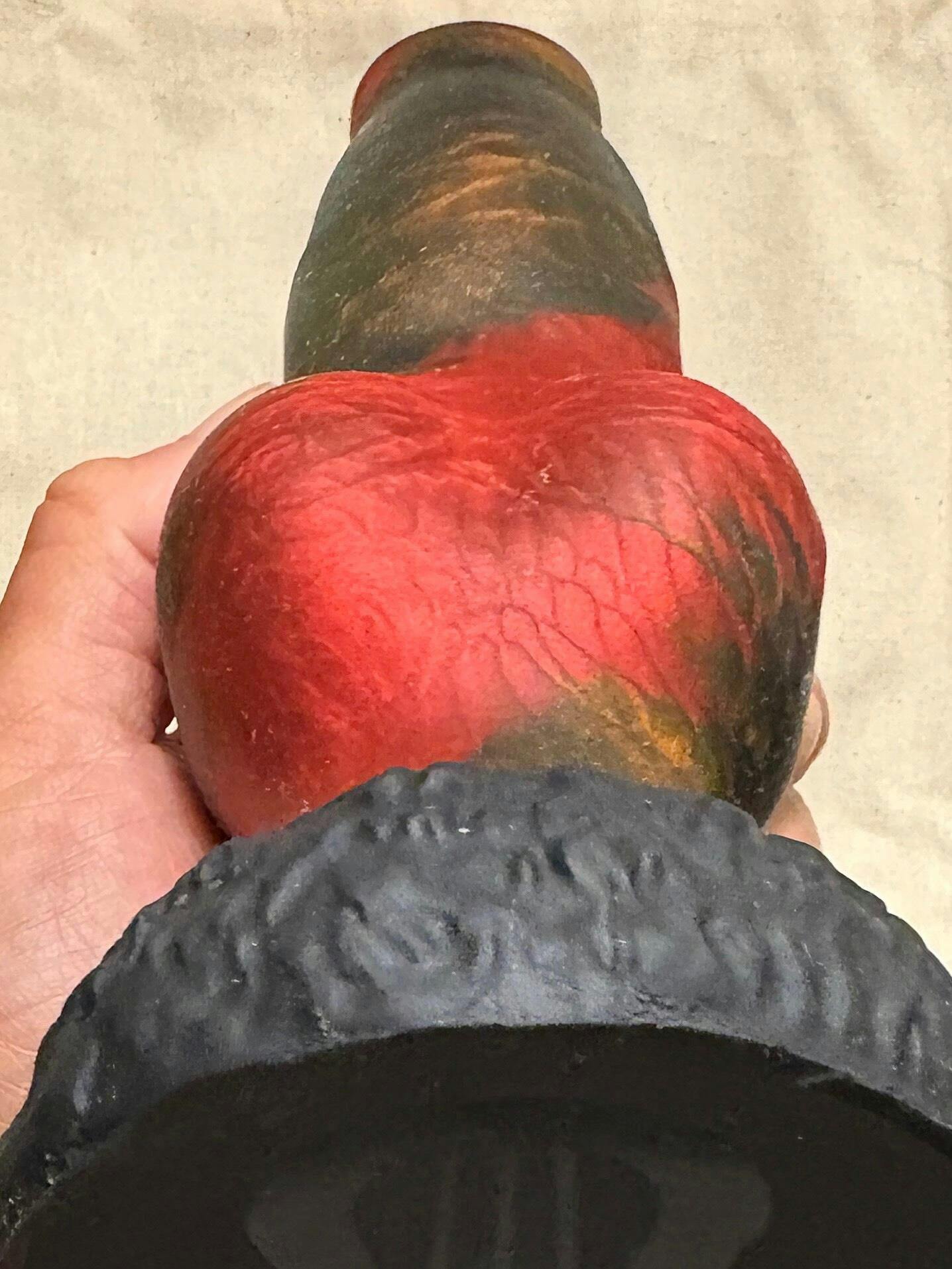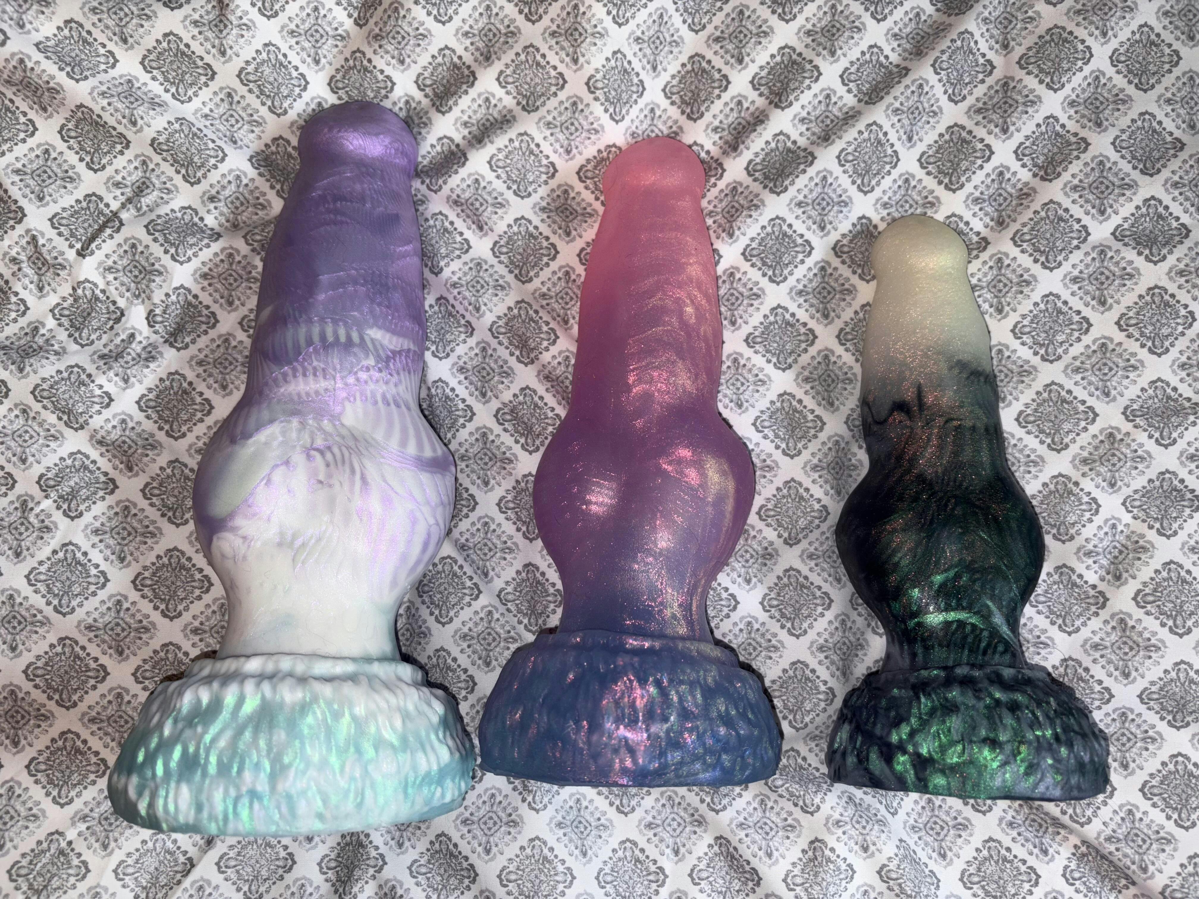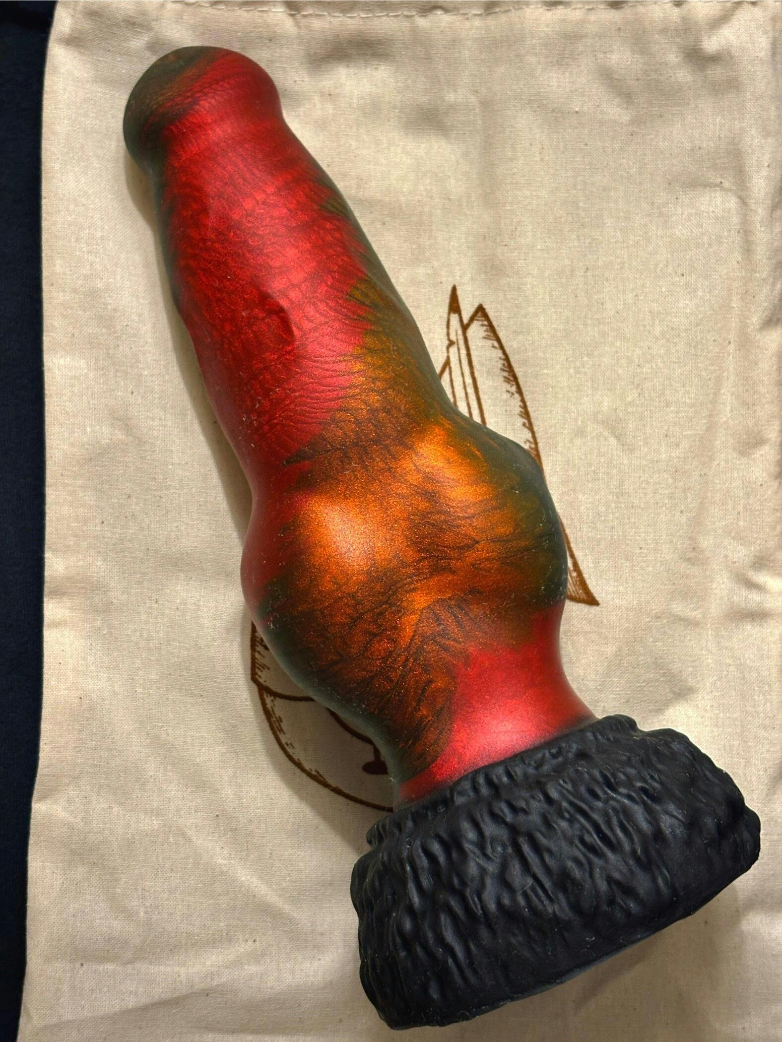 This canine inspired dildo features a tapered & rounded flared tip, varying width shaft with a wide knot meeting a flared base.