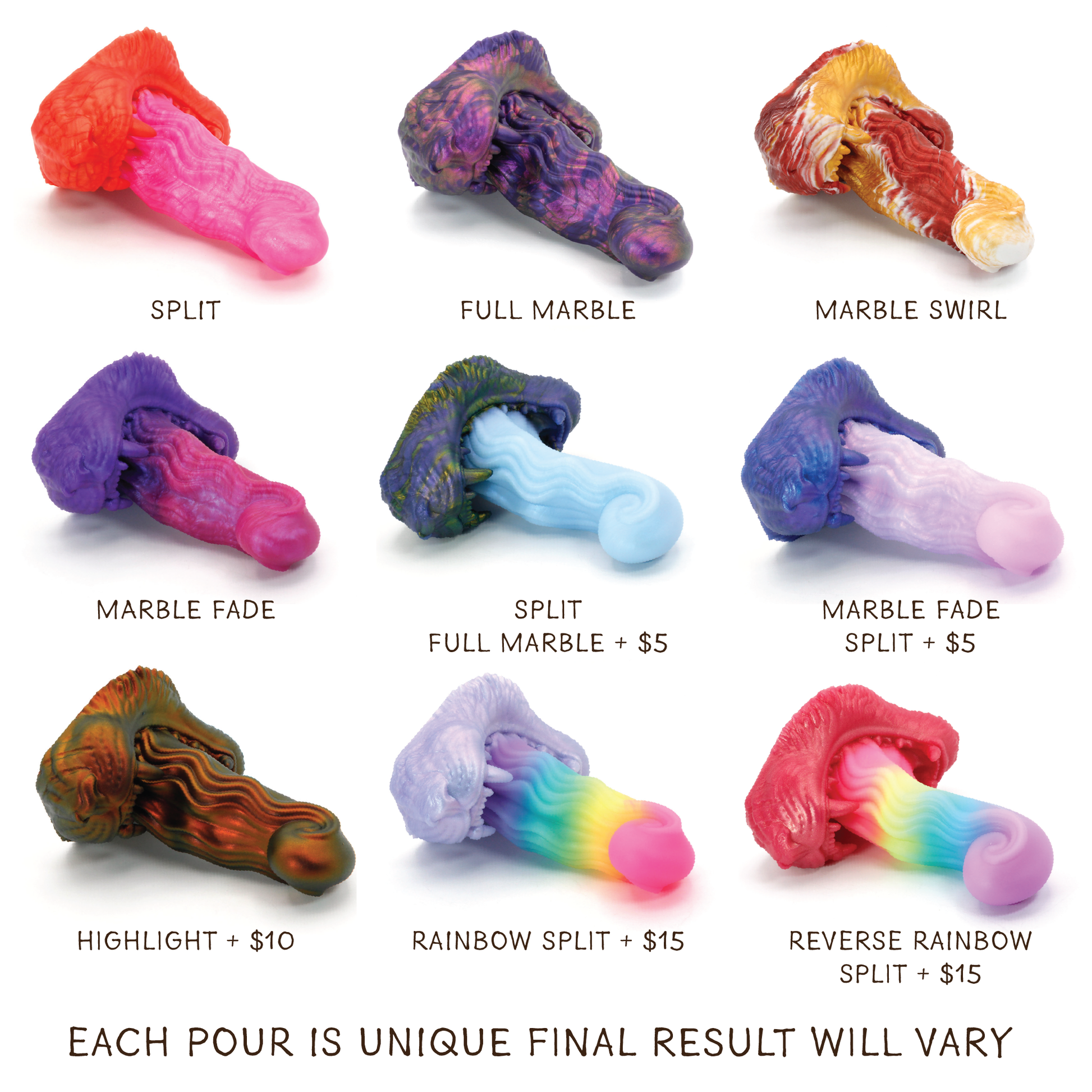 Marble Fade - 1 color at the tip of the tongue that marbles into the base color. An additional color can be added at an additional charge; this will be on the bottom of the base
